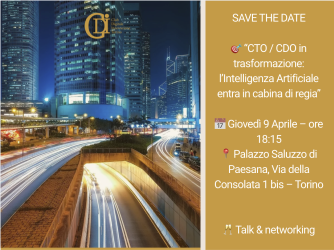Pronti per il nuovo appuntamento dedicato a chi guida l’innovazione in azienda? Questa volta mettiamo al centro il ruolo di CTO e CDO nell’era dell’Intelligenza Artificiale e come queste figure stanno cambiando la cabina di regia. SAVE THE DATE 📅Giovdì 9 aprile – ore 18:15 📍 Palazzo Saluzzo di Paesana, Via della Consolata 1 bis – Torino 🎯 Titolo: “CTO / CDO in trasformazione: l’Intelligenza Artificiale entra in cabina di regia”